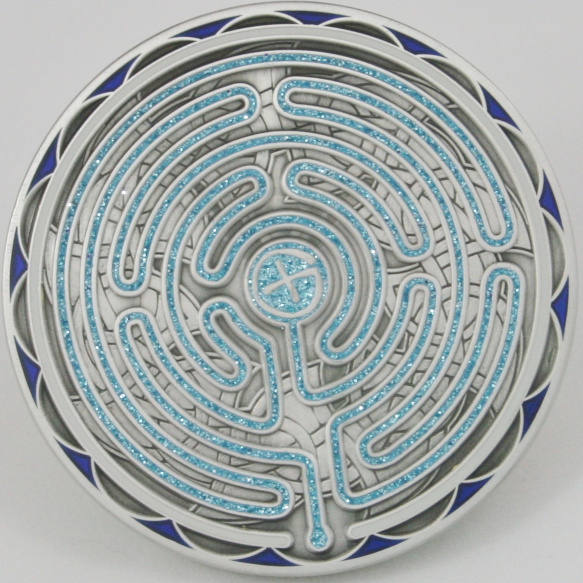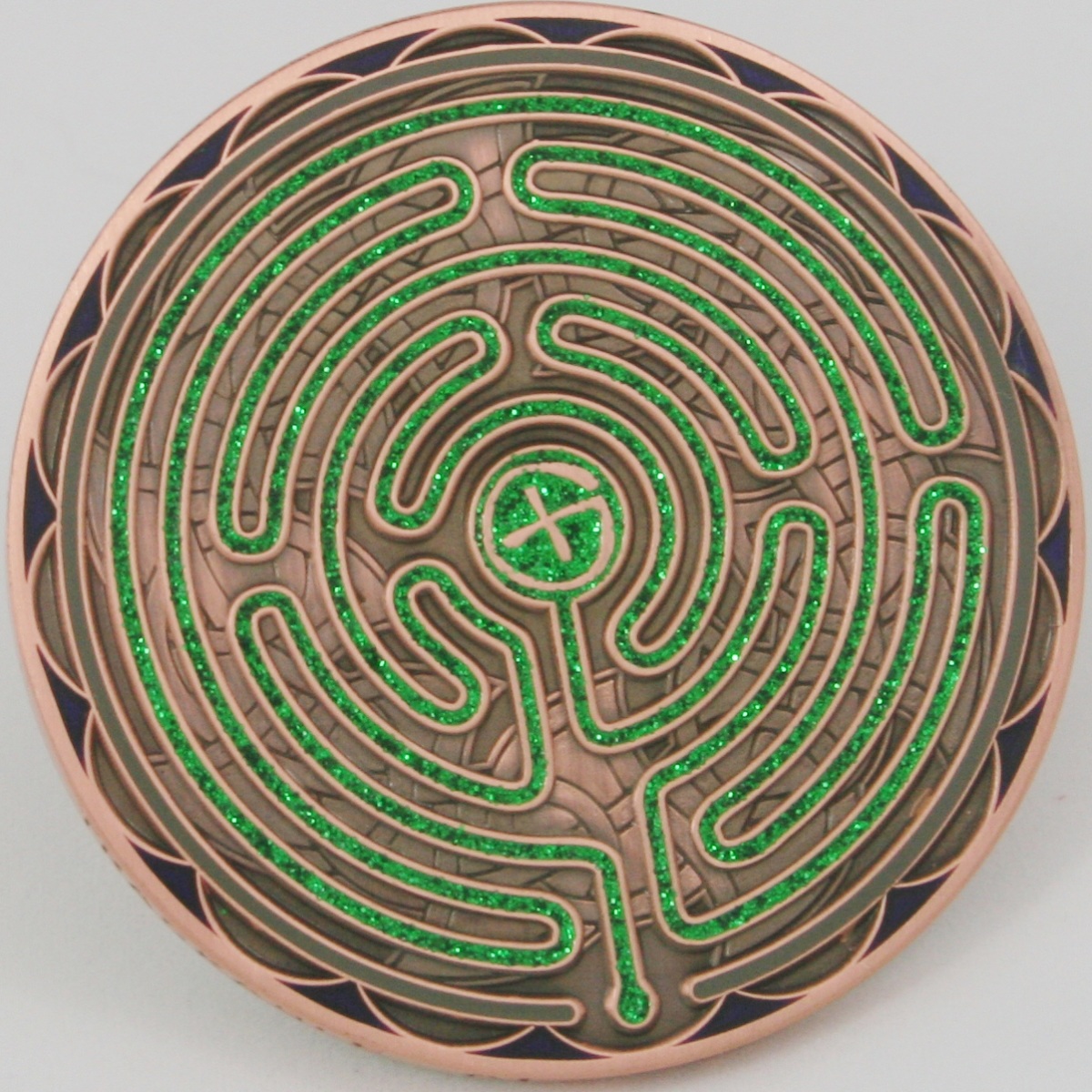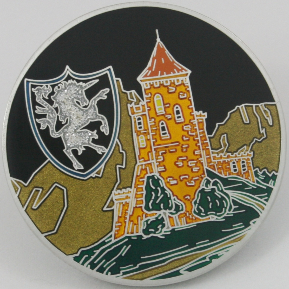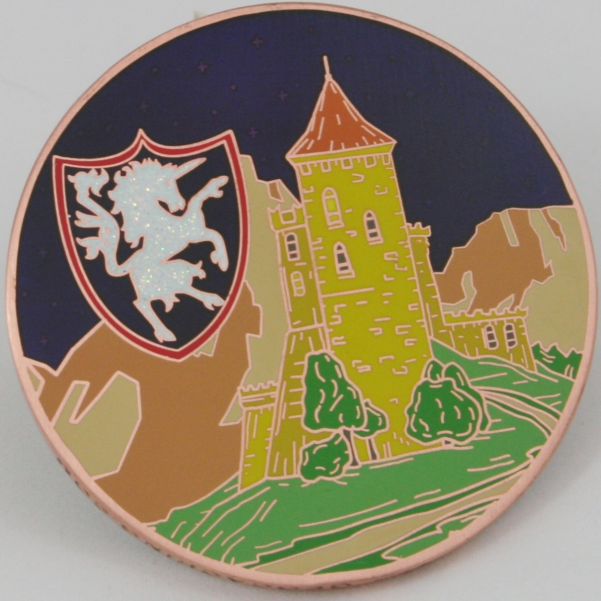 Both NepoKama and Mekle are fans of Roger Zelazny’s Chronicles of Amber novels, which were the inspiration for Road’s End. One side of the coin features our interpretation of the Great Pattern of Amber, the other a castle at the end of the road representing the city Amber (the home of the Pattern) as well as the Unicorn sigil of the ruling house of Amber. For those who know the way all roads end at Amber.